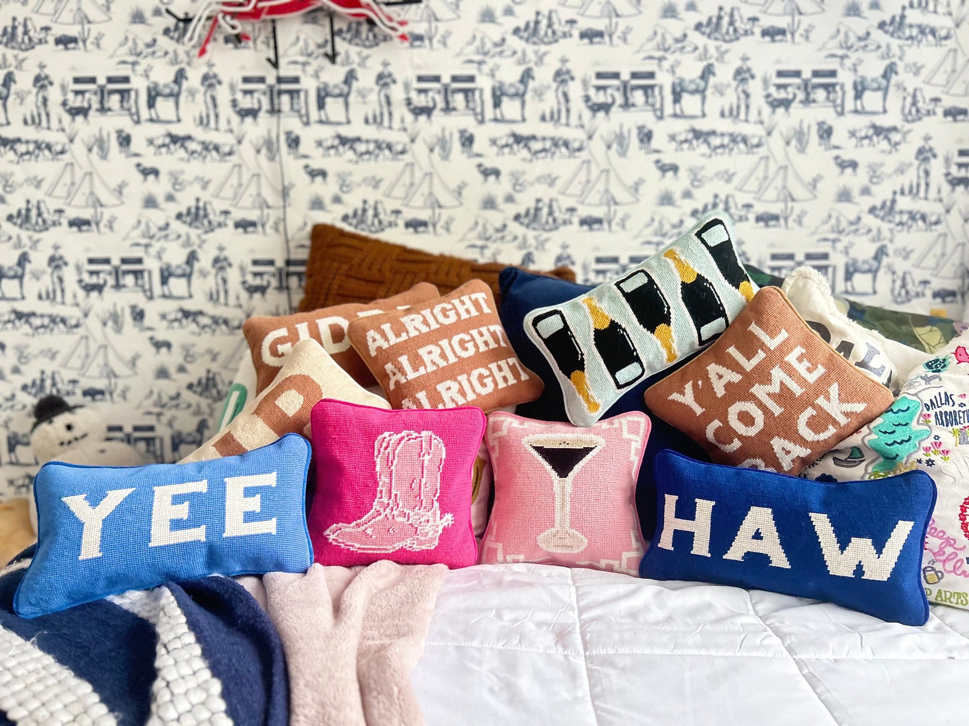 Champagne Needlepoint Pillows: Saddle up your space with this hand-made, and hand-filled needlepoint pillow that evokes the cowboy spirit of the Wild West. Made with quality wool yarn with a soft velvet backing and stuffed with premium poly-fil. These pillows are a part of Southern Decorative's “Charm” collection.